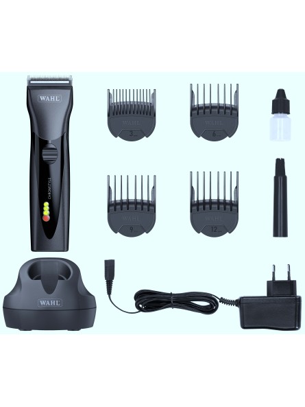 Vendue avec : 4 contre peignes coulissants (3, 6, 9 et 12 mm), 1 socle de charge et 1 chargeur, 1 brosse de nettoyage, 1 huile