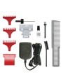 Livrée avec : 3 contre peignes (1.5, 3 et 4.5 mm), socle de charge, brosse de pré-rasage, brosse de nettoyage, huile, protège lame, outils d'ajustement, peigne, chargeur